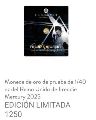 Moneda de oro de prueba del Reino Unido de Freddie Mercury, edición limitada. - Peso: 1/40 oz. - Año: 2025. - Edición limitada a 1250 unidades. Envuelta en una elegante tarjeta , esta moneda se convierte en más que un objeto: se convierte en un portal al rugido de Live Aid, la magia de Queen y el espíritu imperecedero de un ícono británico. Con una tirada limitada a tan solo 1250 piezas, esta conmemorativa de oro puro se erige como un homenaje excepcional y solemne a una leyenda que marcó una época.