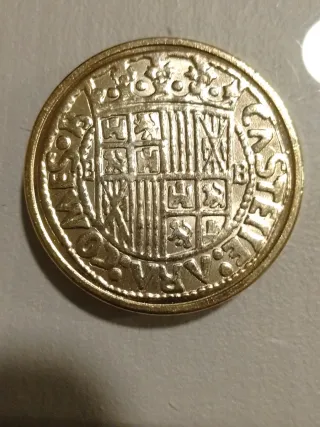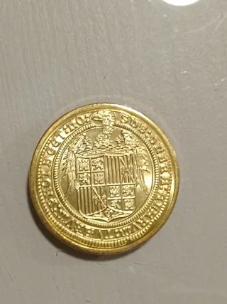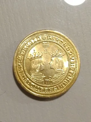 Moneda con baño de oro de 24 quilates.acuñada por la Real casa de la moneda y timbre.4 excelentes Segovia sin Fecha - Diseño con dos perfiles coronados. - Inscripción en el borde.