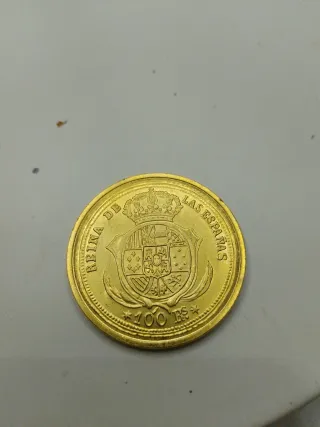 Moneda conmemorativa de 100 Reales, con un baño de oro de 24 quilates. - Diseño detallado con escudo y corona. - Inscripción REINA DE LAS ESPAÑAS y 100 RS.