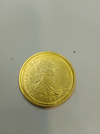 Réplica de moneda de Carlos III del año 1760, con un baño de oro de 24 quilates. - Diseño detallado del busto del rey. - Inscripción CAROLUS III D.G. HISP ET IND REX. - Año de acuñación: 1760.