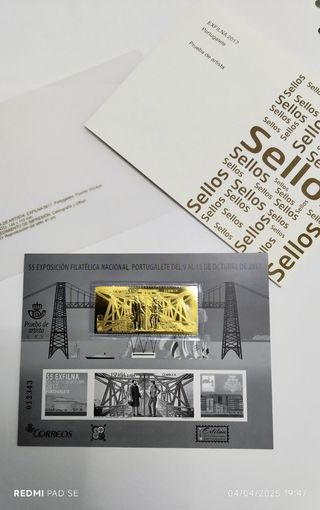 Prueba de artista 133 Exfilna 2017 Portugalete puente metálico sello de plata y oro con su carpeta original y certificado de autenticidad de la Fábrica de Moneda y Timbre, el sello está perfecto como se puede ver en la foto. Más series en mi perfil se hacen envíos conjunto.