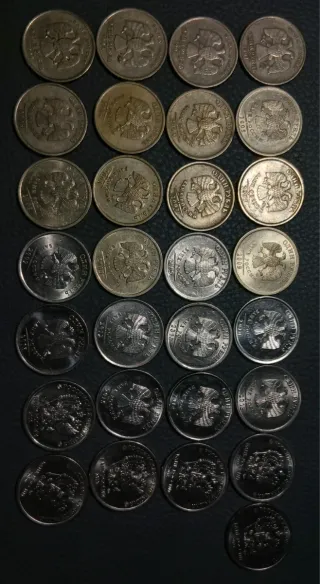 Conjunto de 35 monedas conmemorativas de Rusia. Cada moneda presenta un diseño único. Todas diferentes. Si le falta alguna en su coleccion no dude en preguntar y se la buscamos. Se aceptan cambios por monedas conmemorativas de 2€ Palabras clave: Monedas coleccion, Rusia, URSS, Unión Soviética, Billetes, Oro, Plata, Inversión, Rublo.
