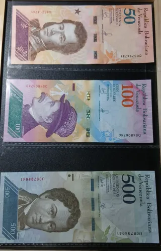 Conjunto de tres billetes de la República Bolivariana de Venezuela. - Billetes de 50, 100 y 500 Bolívares. - Diseños con retratos de próceres venezolanos. - Incluyen elementos de seguridad como marcas de agua y bandas holográficas. Palabras clave: Monedas coleccion, Rusia, URSS, Unión Soviética, Billetes, Oro, Plata, Inversión, Rublo.
