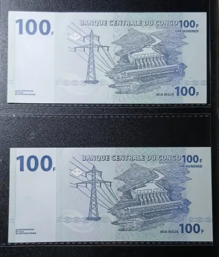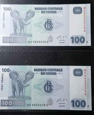 Dos billetes de 100 Francos de la República Democrática del Congo. Son correlativos. - Serie ME. - Fecha: 30.06.2013. - Diseño con elefante. Palabras clave: Monedas coleccion, Rusia, URSS, Unión Soviética, Billetes, Oro, Plata, Inversión, Rublo.