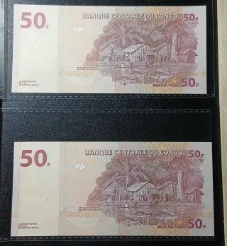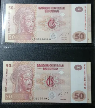 Dos billetes de 50 Francos de la República Democrática del Congo, con números de serie correlativos. - Año de emisión: 2013. - Diseño con retrato de una figura tribal. - Denominación: 50 Francos. Palabras clave: Monedas coleccion, Rusia, URSS, Unión Soviética, Billetes, Oro, Plata, Inversión, Rublo.