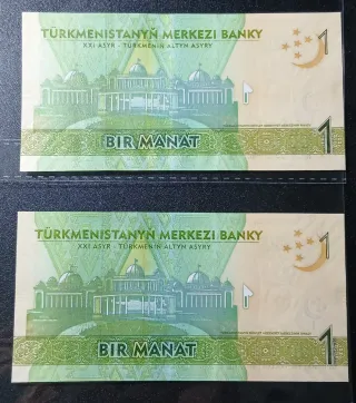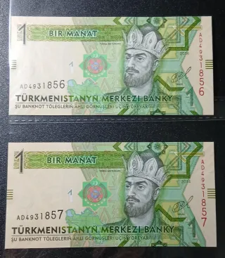 Se venden dos billetes de 1 Manat de Turkmenistán, con números de serie correlativos. - Billetes de 1 Manat. - Números de serie AD4931856 y AD4931857. - Año de emisión 2014. Palabras clave: Monedas coleccion, Rusia, URSS, Unión Soviética, Billetes, Oro, Plata, Inversión, Rublo.