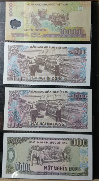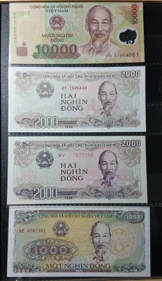 Lote de cuatro billetes de Vietnam. Nuevos Sin Circular - Un billete de 10,000 Dong. - Dos billetes de 2,000 Dong. - Un billete de 1,000 Dong. Palabras clave: Monedas coleccion, Rusia, URSS, Unión Soviética, Billetes, Oro, Plata, Inversión, Rublo.