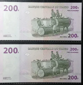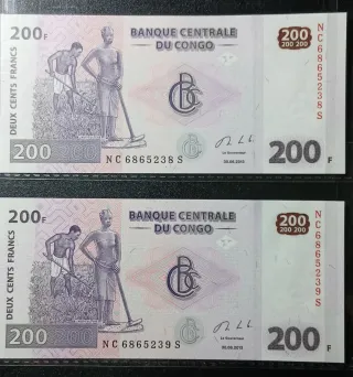 Dos billetes de 200 Francos de la República Democrática del Congo. Son billetes correlativos. - Denominación: 200 Francos. - País: República Democrática del Congo. - Serie: NC6865238S y NC6865239S. - Fecha de emisión: 30.06.2013. Palabras clave: Monedas coleccion, Rusia, URSS, Unión Soviética, Billetes, Oro, Plata, Inversión, Rublo.