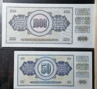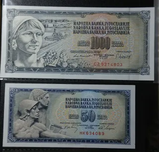 Conjunto de dos billetes de Yugoslavia. Nuevos Sin Circular - Billetes de 1000 y 50 dinares. - Diseño con retratos y motivos agrícolas. - Texto en serbio y croata. Palabras clave: Monedas coleccion, Rusia, URSS, Unión Soviética, Billetes, Oro, Plata, Inversión, Rublo.