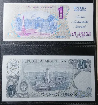 Conjunto de dos billetes de la República Argentina. - Un billete de 1 Valor - Un billete de 5 Pesos. Palabras clave: Monedas coleccion, Rusia, URSS, Unión Soviética, Billetes, Oro, Plata, Inversión, Rublo.