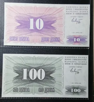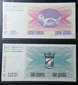Conjunto de dos billetes de Bosnia y Herzegovina 1992 - Un billete de 10 Dinara. - Un billete de 100 Dinara Palabras clave: Monedas coleccion, Rusia, URSS, Unión Soviética, Billetes, Oro, Plata, Inversión, Rublo.