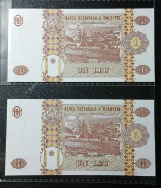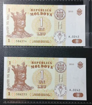 Dos billetes de 1 Leu de Moldavia, año 2010. Los números de serie son correlativos. Nuevos Sin Circular - Billetes de la República de Moldavia. - Denominación: 1 Leu. - Año: 2010. - Números de serie: 586314 y 586315. Palabras clave: Monedas coleccion, Rusia, URSS, Unión Soviética, Billetes, Oro, Plata, Inversión, Rublo.