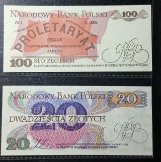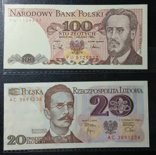 Lote de dos billetes de Polonia. Nuevos Sin Circular - Billetes de 100 Zlotych (1988) y 20 Zlotych (1982). - Diseño con retratos de Ludwik Warynski y Romuald Traugutt. Palabras clave: Monedas coleccion, Rusia, URSS, Unión Soviética, Billetes, Oro, Plata, Inversión, Rublo.