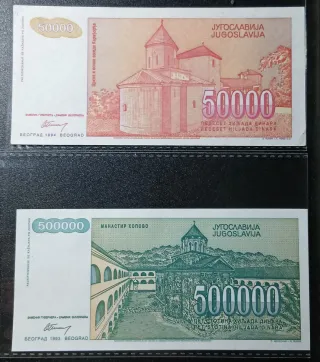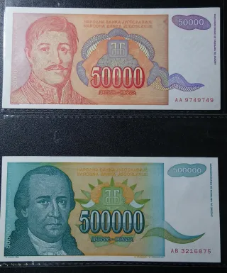 Conjunto de dos billetes de la antigua Yugoslavia. Nuevos Sin Circular. - Billetes de 50.000 y 500.000 Dinara. - Diseño con retratos y motivos nacionales. Palabras clave: Monedas coleccion, Rusia, URSS, Unión Soviética, Billetes, Oro, Plata, Inversión, Rublo.
