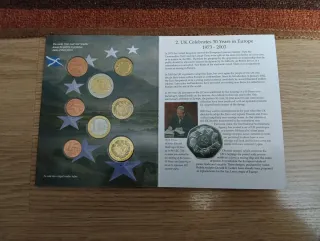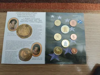 Colección de euros del Reino Unido de 2003, edición Triple Celebration. - Conmemora la unión de los tronos de Inglaterra y Escocia en 1603. - Incluye monedas conmemorativas de la Reina Isabel I y el Rey Jacobo I. - Diseño inspirado en los soberanos de oro de la época. - Símbolos de la rosa y el cardo que representan la unión de ambos reinos.