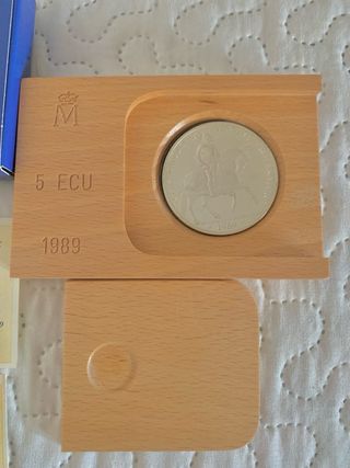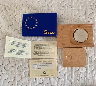 Moneda de 5 ECU de plata de la Fábrica Nacional de Moneda y Timbre, emitida en 1989. Se presenta NUEVA en su estuche de madera, caja y con certificado. - Composición: Plata 925 milésimas, Cobre 75 milésimas. - Peso total: 33,62 gr. - Contenido de plata fina: 31,10 gr (1 onza Troy). - Diámetro: 42 mm. 3 unidades disponibles NO negociable❌