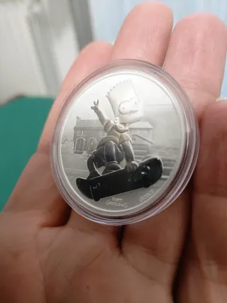 Moneda conmemorativa de Bart Simpson. - Plata de ley 999. - Diseño de Bart Simpson en patineta. - Incluye estuche protector.