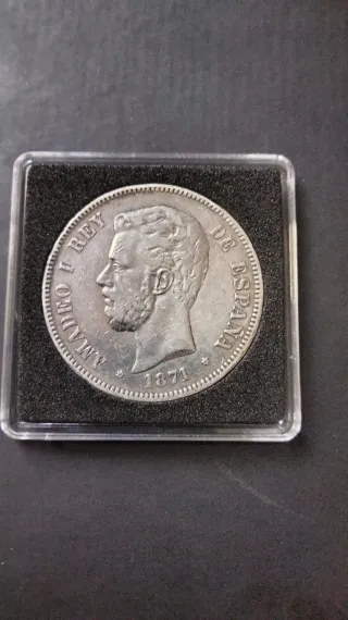 Moneda de plata de 5 pesetas del año 1871, con la efigie de Amadeo I. DEM Estrellas *18*74 visibles. Plata 900. Original. Cápsula no incluida. Se aceptan ofertas o posibles cambios por monedas similares. Relacionado: España, historia, coleccionismo, numismática, inversión, rey, monarca, cultura.