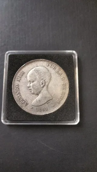 Moneda de plata de 5 pesetas del año 1891, con el busto de Alfonso XIII, pelón. Estrellas *18*91 visibles. Plata 900. Original. Cápsula no incluida. Se aceptan ofertas o posibles cambios por monedas similares. Relacionado: España, historia, coleccionismo, numismática, inversión, rey, monarca, cultura.
