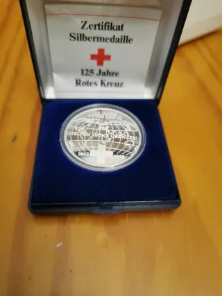 Medalla conmemorativa de plata del 125 aniversario de la Cruz Roja. - Certificado de Silbermedaille (Medalla de Plata). - Conmemora 125 Jahre Rotes Kreuz (125 años Cruz Roja). - Presenta un retrato de Henry Dunant. - Incluye estuche azul de terciopelo.