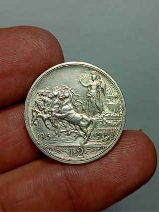 Moneda de plata de 2 Liras italianas conmemorativa de la Cuadriga Romana. - Año: 1915 - Material: Plata - Diseño: Cuadriga Romana - Valor: 2 Liras Muy bonita!! - Pago por transferencia o Bizum