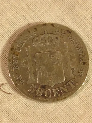 Antigua moneda de plata conmemorativa de Alfonso XIII. 50 céntimos de 1892. Plata de 900. Está moneda se llamó Pelón. El "pelón" muestra el perfil del rey niño con rizos escasos, a menudo descrito con aspecto de "bebé". Se acuñó bajo la regencia de María Cristina de Habsburgo-Lorena. Características: Son monedas de plata (90% plata, 10% cobre) con un peso de 25 gramos. La mayoría de estas monedas se acuñaron en la Ceca de Madrid, mostrando estrellas con la fecha de acuñación real. En esta semana ha perdido bastante detalle. - Año: 1892 - Inscripción: ALFONSO XIII POR LA G. DE DIOS - Material: Plata C170.