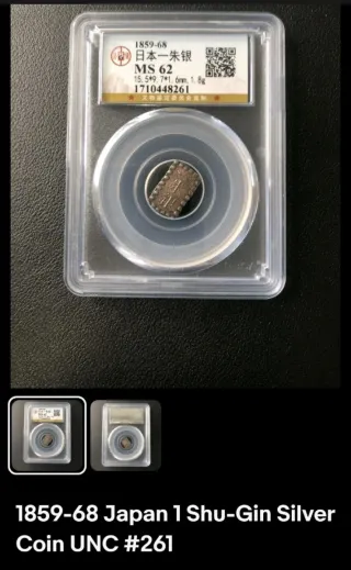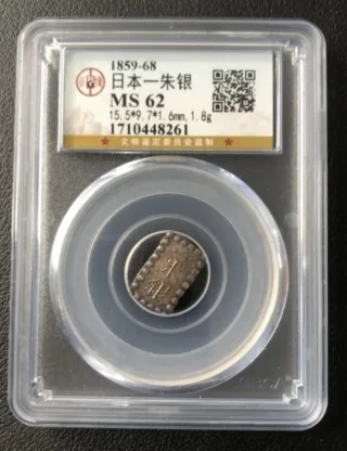 Moneda de plata japonesa de 1 Shu-Gin, acuñada entre 1859 y 1868. Se encuentra en condición UNC (Uncirculated). - Material: Plata. - Año: 1859-1868. - Grado de conservación: MS 62. - Dimensiones: 15.5*9.7*1.6mm. - Peso: 1.8g. - Número de certificación: 1710448261.