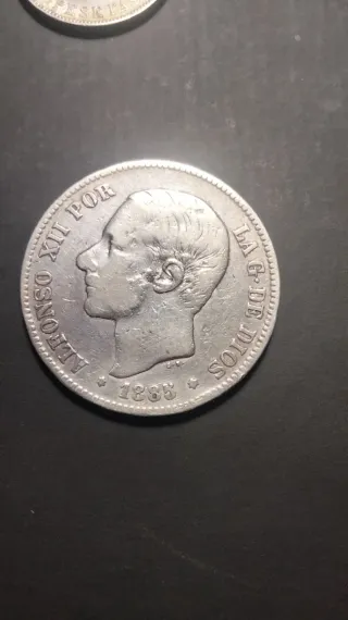 Moneda de plata con la efigie de Alfonso XIII. - Año de acuñación: 1883. - Leyenda: ALFONSO XIII POR LA G DE DIOS.
