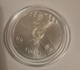 Moneda conmemorativa de plata de 2 libras. De 1994 - Conmemora el 50 aniversario del desembarco de Normandía (1944-1994). - Diseño detallado con escena del desembarco y retrato. - Acabado en plata.