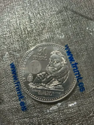 Moneda de plata conmemorativa de Miguel de Cervantes. - Valor facial de 30 Euros. - Diseño detallado del escritor. - Material: Plata.