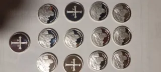Preciosa colección de 13 arras de plata de Ibernumis, que representan a los Reyes de Asturias y la cruz de la Victoria en el reverso, con la leyenda Principado de Asturias, arras matrimonio, 1990, una de ellas lleva en el reverso a la santina de Covadonga, 20 mm de diámetro, perfecto estado