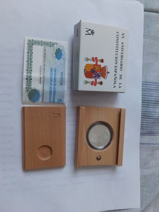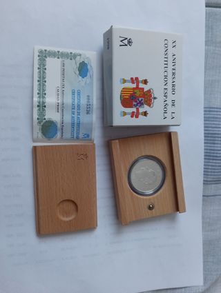 Moneda de mil pesetas de plata de 1998 del 20 aniversario de la Constitución española con su certificado cajas de madera y cartón