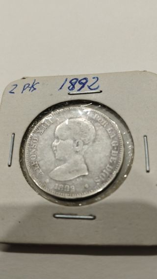 Moneda de 2 pesetas españolas de 1892 del rey Alfonso XIII. - Moneda de plata. - Inscripción PG M..
