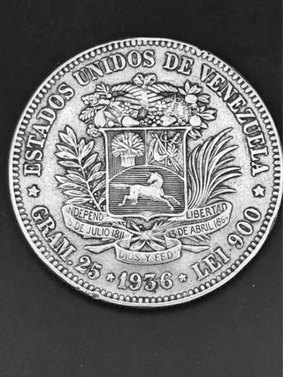 Moneda de 5 Bolívares de Venezuela de plata 900 - Diseño con el escudo nacional. - peso: 24,90 - Ley 900. No leer: l2x 34 moneda antigua de plata españa española peseta real reales escudo escudos primera republica error variante alfonso XII XIII amadeo I franco caudillo paquillo inversion coleccion coleccionismo oro plata pura plata 900 999 duro lote duros onza onzas sc sin circular inversion dollar conmemorativa billetes filatelia república belarminos panda brittania rey reina estuche cartera napoleon independencia spot bolsa cotización