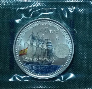 MONEDA CONMEMORATIVA del 97 CRUCERO DE INSTRUCCIÓN DEL BUQUE JUAN SEBASTIÁN ELCANO PRECINTADAS. El ANVERSO muestra una imagen a COLOR del BUQUE ESCUELA JUAN SEBASTIÁN ELCANO ondeado la bandera española, valor facial y ceca. En el REVERSO nueva efigie de SU ALTEZA REAL LA PRINCESA DE ASTURIAS, LEONOR DE BORBÓN Y ORTIZ. TIRADA de 1.000.000 unidades. Fecha de EMISIÓN junio 2025 COLOR, DIÁMETRO 33mm VALOR FACIAL 40E PLATA PUREZA 925 mm PESO 18 g