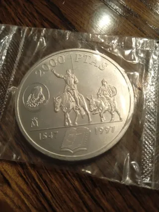 Moneda de plata conmemorativa de 2000 pesetas del año 1997. - 450 aniversario del nacimiento de Miguel de Cervantes - 18 gramos plata 925. Valor actual plata a mas de 2,30€ gramo - coleccionismo o inversion