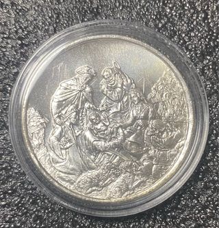 Moneda de 1 oz plata 999 con un grabado detallado de una escena religiosa,( Nacimiento ) posiblemente una natividad. - Diseño en relieve. - Acabado brillante. -Preferentemente en mano, zona Valencia