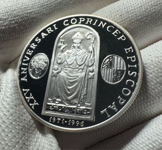 Moneda conmemorativa de 10 Diners 1996 en plata. Prueba de plata Plata:0,925 Peso:31,52g - Diseño del copríncipe episcopal. - Grabado de XXV Aniversario y 1971-1996. - Detalle de un obispo sentado y escudos. - Borde con inscripciones. - Material: Plata. Tel:616951801/ Ati wasap Ref:2592/90