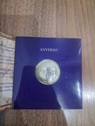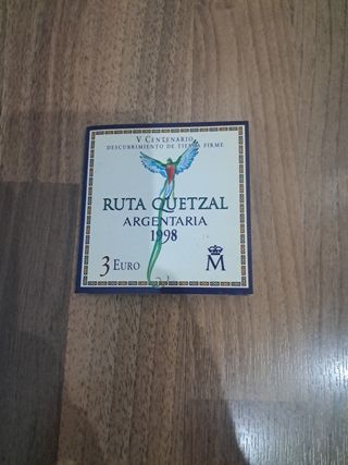 Moneda de 3€ de plata conmemorativa del v centenario descubrimiento de tierra firme ruta quetzal Argentina 1998