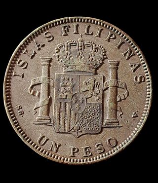 Moneda plata de 1 Peso de Filipinas del año 1897. - Anverso: Retrato de Alfonso XIII. - Reverso: Escudo de Filipinas. - Canto: Estrellas y año.