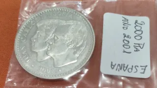 Moneda conmemorativa de 2000 pesetas de plata. Última moneda de peseta emitida. 16.65g plata pura Premio a la mejor moneda del mundo 2001. - Anverso: Retratos de Juan Carlos I y Sofía de Grecia. - Reverso: Inscripción ESPAÑA y año 2001. - Material: Plata.