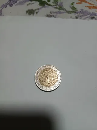 Moneda de 2 euros de Francia. Presenta un diseño con un árbol y las inscripciones Liberté Égalité Fraternité. - Diseño del árbol de la vida. - Inscripción Liberté Égalité Fraternité. - Bimetálica (dorada y plateada).