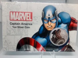 Moneda de la serie Marvel de plata 999 de inversión del Capitán América, acuñada en Tuvalu en 2019.- Peso: 1 Onza., 31,1 gramos. - Diseño detallado del personaje.- Acabado en plata de alta calidad. Posibilidad de en6en plaza Cataluña. No bajo precio.