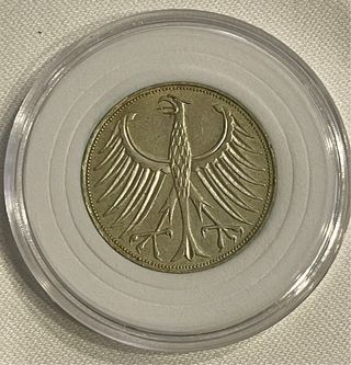Moneda de 5 Deutsche Mark de la Alemania Federal. Presenta un diseño de águila. - Diseño de águila. - Moneda de colección. -Metal: plata 625‰