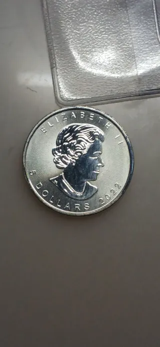 Moneda de colección Maple Leaf del año 2022. - Reverso: Presenta la hoja de arce canadiense. - Anverso: Retrato de la Reina Isabel II. - Valor nominal: 5 Dólares Canadienses.