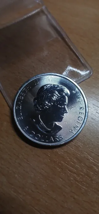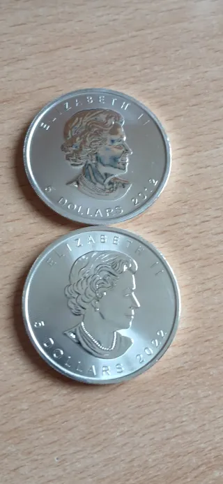Se venden dos onzas de plata de la Maple Leaf, conmemorativas del año 2012 y 2022. - Cada moneda tiene un valor nominal de 5 dólares canadienses. - Diseño de la Reina Elizabeth II en el anverso. - Acabado brillante y detallado.