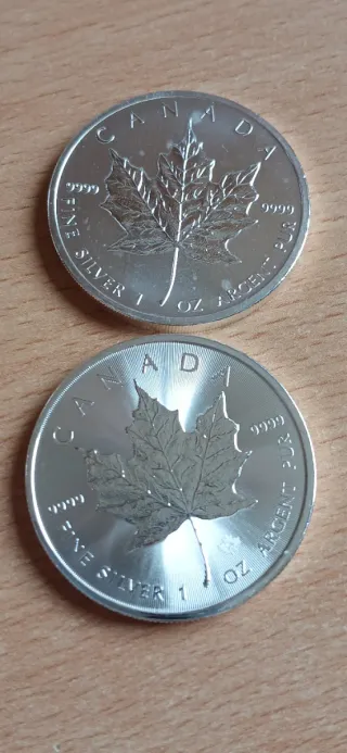 Se venden dos monedas de plata pura de Canadá. - Diseño de la hoja de arce. - 1 oz de plata fina (9999). - Fine Silver 1 oz Argent Pur grabado en el canto.