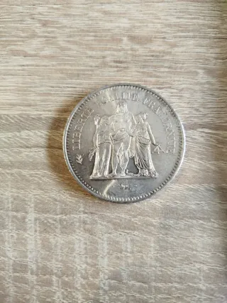 Hay 5 monedas a 80€ cada una. Moneda de 50 francos franceses de plata,acuñada en el año 1977. Presenta un diseño clásico con alegorías. - Material: Plata. - Año: 1977. - Denominación: 50 Francos. - Peso: 30gr - 900 plata pura (27gr)