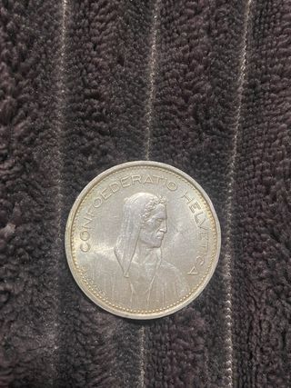 Moneda de plata conmemorativa de la Confederación Helvética. - Diseño clásico con perfil. - Inscripción Confoederatio Helvetica.