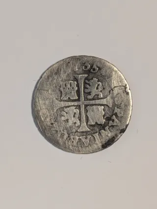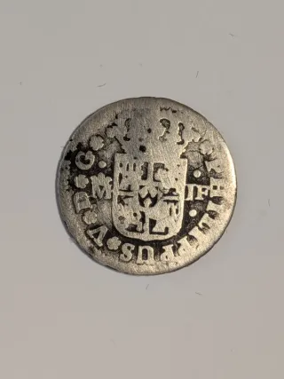 Medio Real de plata de la época de Felipe IV, acuñado en Madrid en el año 1735. Plata, diámetro aprox. 15 mm. Peso 1,15 g (ver foto en báscula). Moneda original, circulación marcada y rayas visibles, ideal como pieza de colección económica.